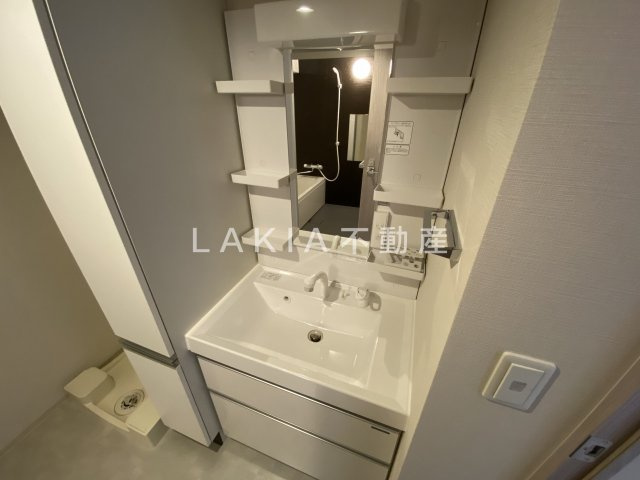 脱衣所は、明るく清潔感のある空間で、日々の身支度やスキンケアを心地よく行える設計。洗面台周りには十分なスペースがあり、朝の支度もスムーズです。タオルや洗剤を収納できる棚も備わっており、生活感を抑えたすっきりとした印象に。床材は水に強い素材を使用しており、お手入れも簡単。バスルームとの動線も短く、快適な使い勝手を実現しています。シンプルながらも機能的な、上質さを感じる脱衣スペースです。